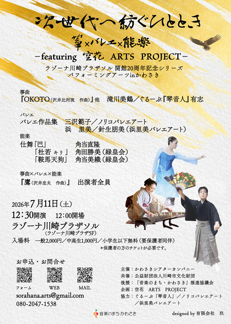 「パフォーミングアーツinかわさき」空花 ARTS PROJECT次世代へ紡ぐひととき 箏×バレエ×能楽 ~featuring 空花 ARTS PROJECT~ 邦楽:滝川美鶴、バレエ:三沢範子、能楽:角当直隆が集結。 今回は、ぐるーぷ「琴音人」、ノリコバレエアート、浜里美バレエアート、の有志と、能楽の舞台に立つ角田勝美・角当美織が出演し、若手たちがそれぞれの芸術を紹介。 最後は、沢井忠夫作曲「鷹」に乗せて、出演者全員で共演♪ 【ウェブサイト】 ▶ 空花 ARTS PROJECT ▶ パフォーミングアーツinかわさき ラゾーナ川崎プラザソル 開館20周年記念シリーズ 【主催】かわさきシアターカンパニー 【共催】公益財団法人川崎市文化財団 【後援】「音楽のまち・かわさき」推進協議会 |