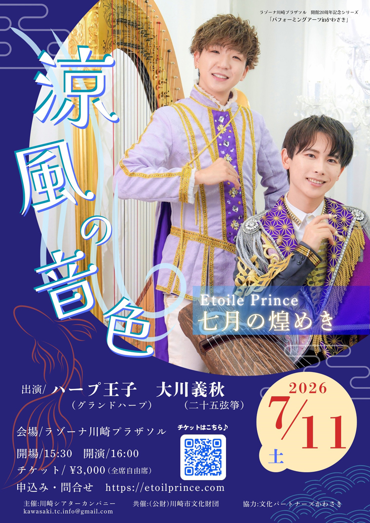 「パフォーミングアーツinかわさき」Etoile Prince (筝&ハープユニット)涼風の音色 七月の煌めき 箏奏者・大川義秋(箏男kotomen)とハープ奏者・小林秀吏(ハープ王子)のユニット。 福島県出身の大川は震災を機に箏と出会い、邦楽コンクール2冠。 川崎出身のハープ王子は高校でハープに魅了され始める。2021年より「癒しと元気」をテーマに47都道府県ツアー、海外公演、CD・MV制作を展開。 箏とハープの煌びやかで透明な響きで、クラシック、日本古典、オリジナル曲を演奏。 【企画運営協力】文化パートナーズかわさき 【ウェブサイト】 ▶ Etoile Princeホームページ ▶ パフォーミングアーツinかわさき ラゾーナ川崎プラザソル 開館20周年記念シリーズ 【主催】かわさきシアターカンパニー 【共催】公益財団法人川崎市文化財団 【後援】「音楽のまち・かわさき」推進協議会 |