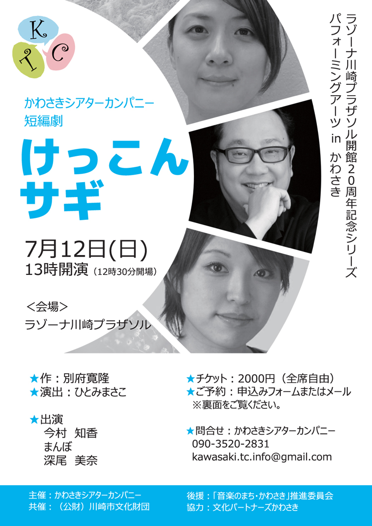 「パフォーミングアーツinかわさき」かわさきシアターカンパニー短編劇「けっこんサギ」 2015年、劇団企てプロジェクトとして旗揚げし、2018年11月に、かわさきシアターカンパニーに名称を変更。川崎市内で数々の作品を上演してきました。 今回は、前代表の別府寛隆による短編作品を上演します。久しぶりの劇団員集合で、どんな熱い舞台になるのか?乞うご期待! 【作】別府寛隆 【出演】まんぼ、今村知香、深尾美奈 【演出】ひとみまさこ 【ウェブサイト】 ▶ かわさきシアターカンパニー X ▶ パフォーミングアーツinかわさき ラゾーナ川崎プラザソル 開館20周年記念シリーズ 【主催】かわさきシアターカンパニー 【共催】公益財団法人川崎市文化財団 【後援】「音楽のまち・かわさき」推進協議会 |