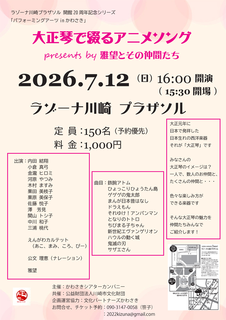 「パフォーミングアーツinかわさき」雅望とその仲間たち大正琴で綴るアニメソング 雅望(笹子まさえ):東京芸術大学大学院修了。声楽家として活躍。現在、大正琴演奏家としてソロやアンサンブルで様々なコンサートにて活躍中。琴伝流大正琴 上級師範。今回は、大正琴の活動仲間や教室の生徒とともに、昭和から令和までのよく知られているアニメソングを演奏する。 【企画運営協力】文化パートナーズかわさき 【ウェブサイト】 ▶ 笹子まさえ X ▶ パフォーミングアーツinかわさき ラゾーナ川崎プラザソル 開館20周年記念シリーズ 【主催】かわさきシアターカンパニー 【共催】公益財団法人川崎市文化財団 【後援】「音楽のまち・かわさき」推進協議会 |