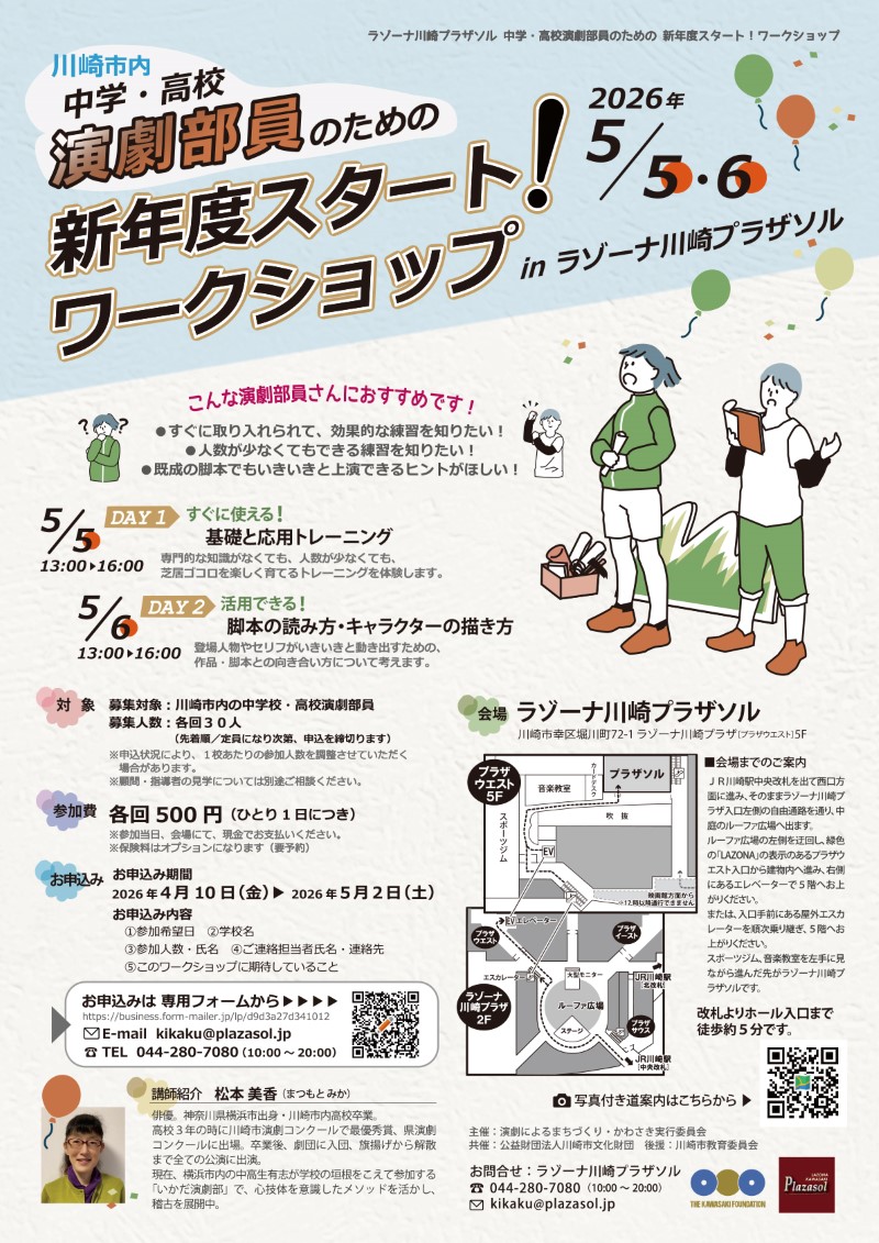 川崎市内 中学・高校演劇部員のための新年度スタート!ワークショップ新年度、メンバーが変わって今年度の活動をスタートするこの時期、専門的な指導者や、定型メソッドがない演劇部のみなさんの、スタート時期のお悩みに役立つワークショップを開催します。 楽しみながら芝居ゴコロを育てるヒントを見つけていきましょう。 【開催日・内容】 ◯5/5(火祝)13:00~16:00 DAY1 「すぐに使える!基礎と応用トレーニング」 ◯5/6(水祝)13:00~16:00 DAY2 「活用できる!脚本の読み方・キャラクターの描き方」 ※各日は独立した内容です。どちらか片方でもご参加いただけます。 【対象】 募集対象:川崎市内の中学校・高校演劇部員 募集人数:各回30人 (先着順/定員になり次第、申込を締切ります) 【講師】 松本美香(俳優/「いかだ演劇部」講師) ※詳細は 申込ページ をご覧ください。 【主催】 演劇によるまちづくり・かわさき実行委員会 【共催】公益財団法人川崎市文化財団 【後援】川崎市文化財団 |